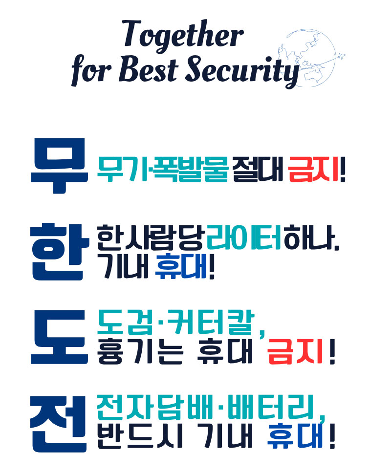 무기류·폭발물 반입 금지 한사람당 라이터는 1인 1개 도검 등의 흉기는 기내 반입 불가 전자담배·보조배터리는 반드시 휴대 수하물 소지 검색대 앞에서 누구나 한눈에 이해할 수 있는 유쾌한 메시지였습니다.
